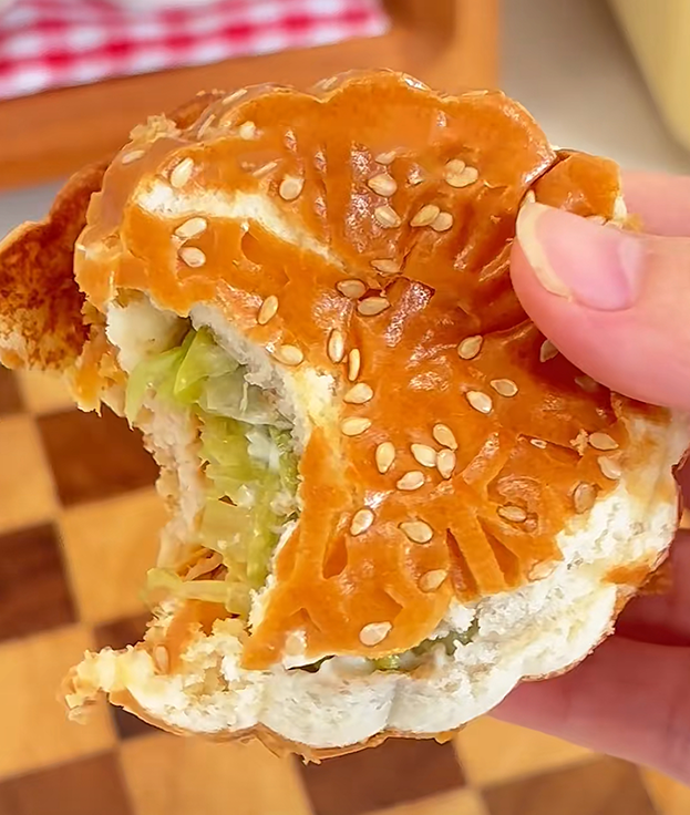 將一個圓滾滾的小漢堡塞入月餅?zāi)>?/p>