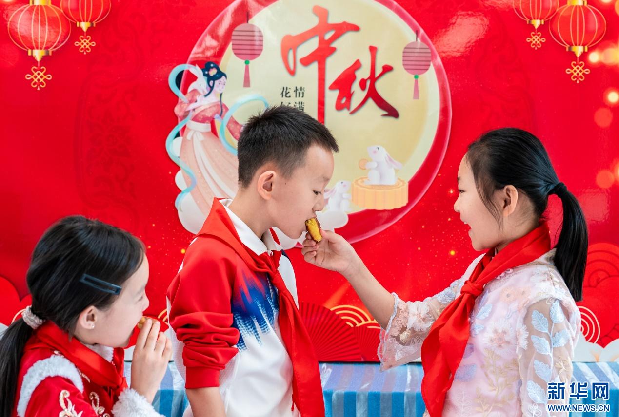 9月28日,呼和浩特市玉泉區(qū)清泉街小學(xué)學(xué)生在中秋節(jié)主題活動(dòng)上品嘗自己制作的月餅。新華網(wǎng)發(fā)(丁根厚 攝)