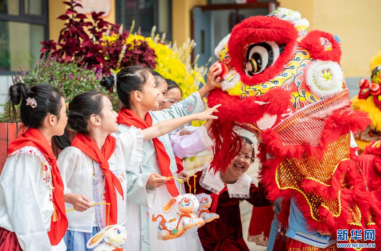 9月28日,呼和浩特市玉泉區(qū)清泉街小學(xué)表演舞獅的學(xué)生在中秋節(jié)主題活動(dòng)上和同學(xué)們互動(dòng)。新華網(wǎng)發(fā)(丁根厚 攝)