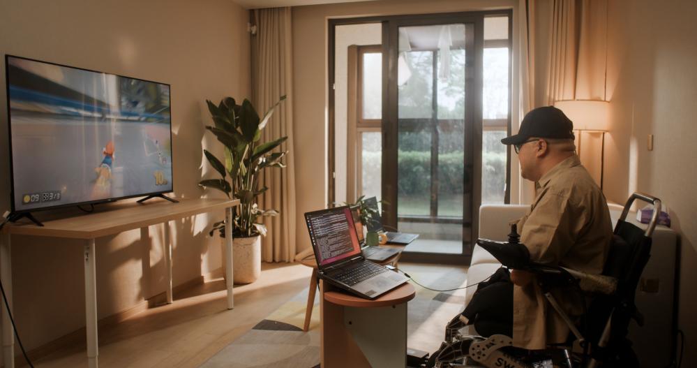 2025年4月30日,在位于上海的受試者住所,受試者通過腦機接口玩賽車游戲。新華社發(fā)(戴焱淼 攝)