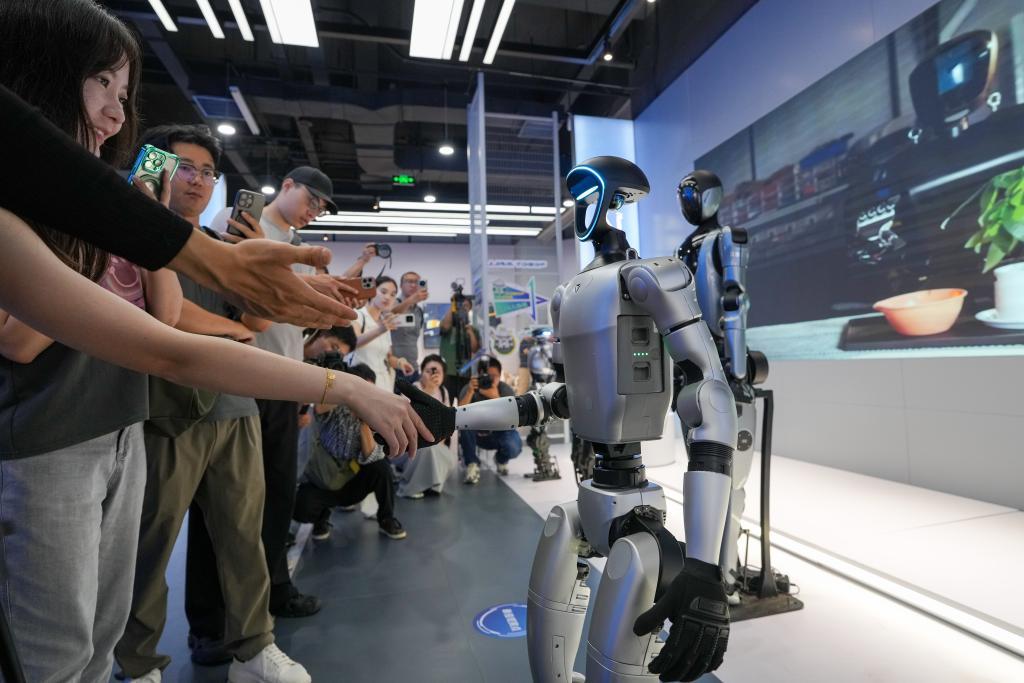 在位于北京經(jīng)開區(qū)的全球首個具身智能機器人4S店(ROBOT MALL)內(nèi),觀眾在與一款人形機器人握手(2025年8月6日攝)。新華社記者 鞠煥宗 攝