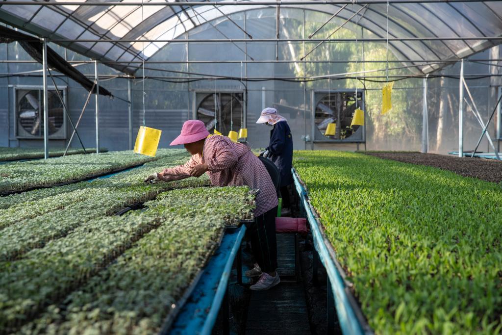 工作人員在云南省元謀縣的育苗工廠大棚內(nèi)進(jìn)行育苗工作。受訪者供圖。