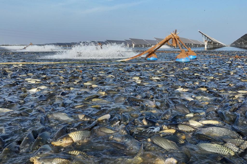 這是河北省唐山市豐南區(qū)黑沿子鎮(zhèn)“漁光一體”現(xiàn)代漁業(yè)產(chǎn)業(yè)園魚塘內(nèi)場(chǎng)景(無(wú)人機(jī)照片)。新華社記者 楊世堯 攝