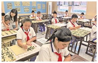 圖為九月十一日,新疆維吾爾自治區(qū)哈密市豫哈第三實(shí)驗(yàn)學(xué)校學(xué)生在寬敞整潔的書法教室里臨摹學(xué)習(xí)書法。