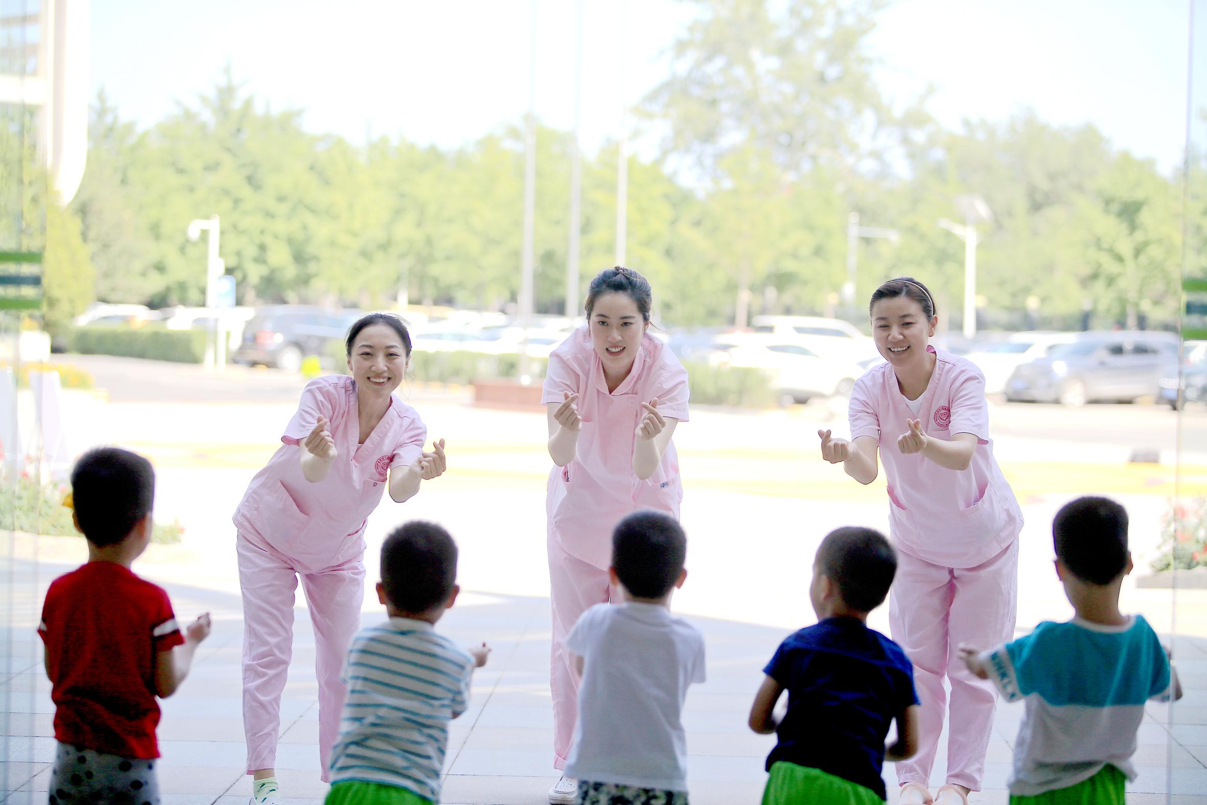 圖為北京兒童福利院護(hù)理人員陪伴孩子們做游戲。