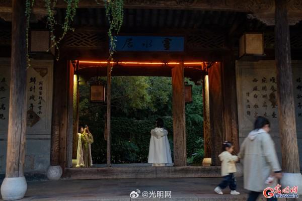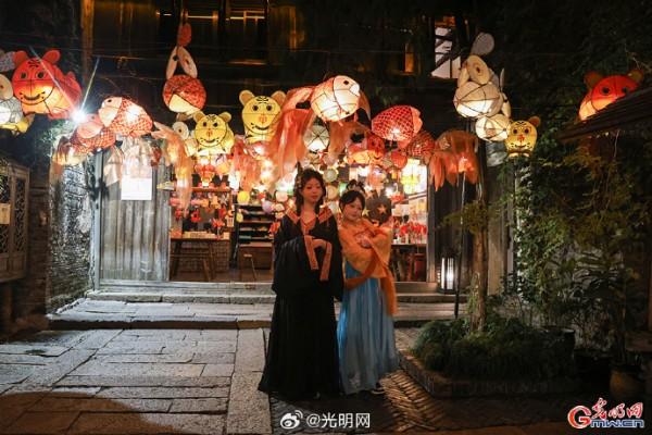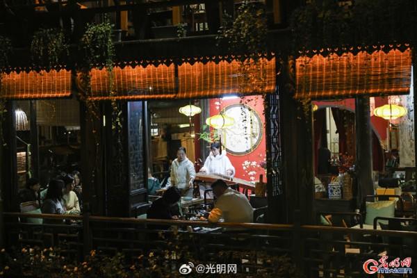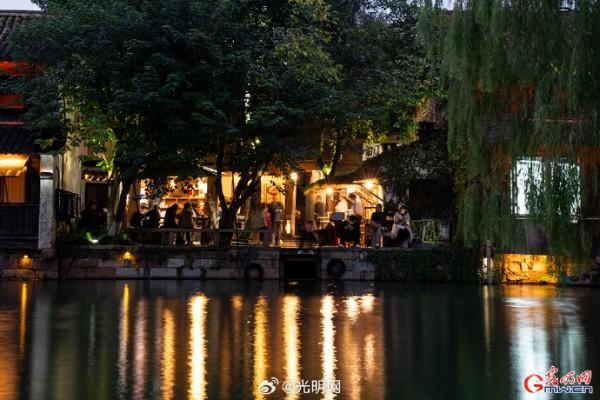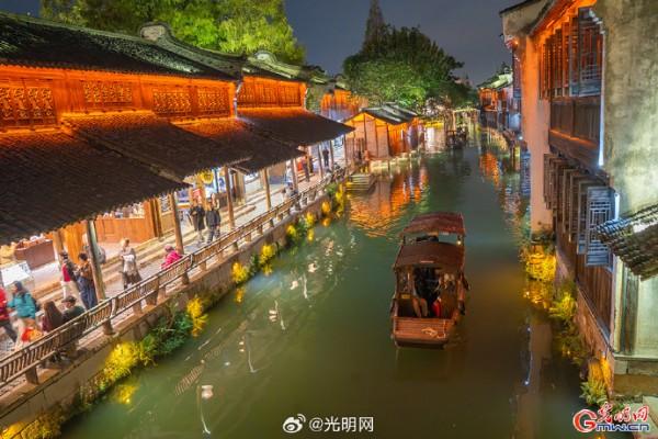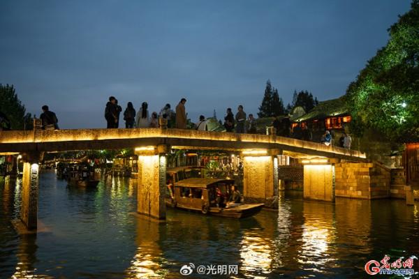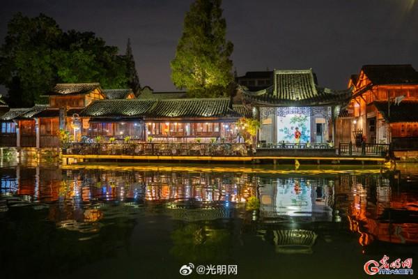 隨著夜幕降臨,河道兩岸燈光點(diǎn)綴,烏篷船緩緩劃過,水面映射出絢麗色彩。當(dāng)暮色浸染白墻黛瓦,烏鎮(zhèn)從素簡(jiǎn)水墨畫蛻變?yōu)榱鞴庖绮实臄?shù)字夢(mèng)境。