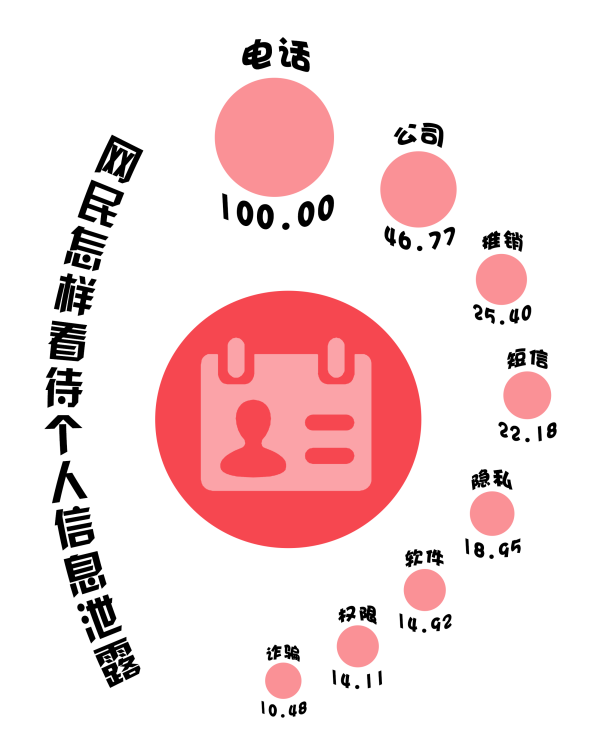 (數(shù)據(jù)來源:選取嗶哩嗶哩視頻《可怕!這7家科技公司盜取身份證信息,4.68億個(gè)人信息泄露》下的931條一級(jí)評(píng)論,做分詞及歸一化處理,進(jìn)行分詞后將熱度最高的詞語(yǔ)規(guī)定為100)