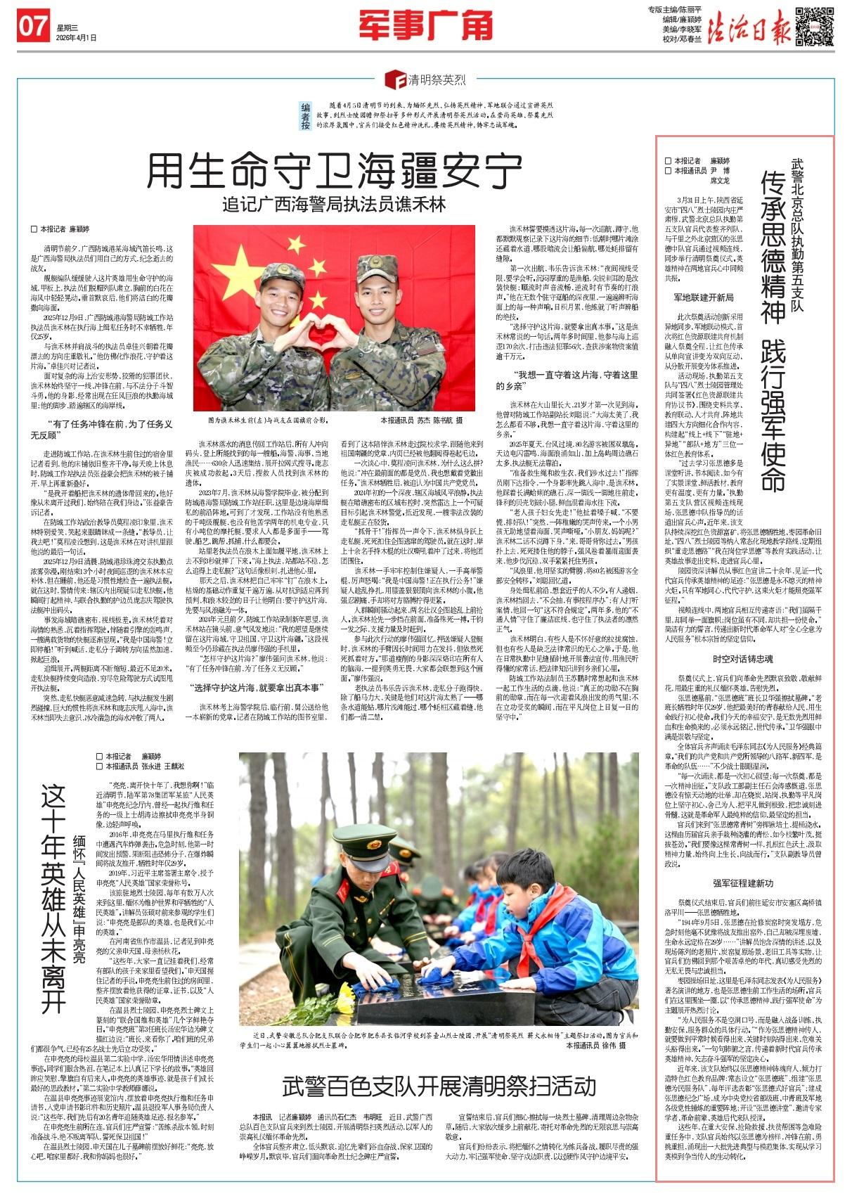 3月31日上午,陜西省延安市“四八”烈士陵園內(nèi)莊嚴(yán)肅穆,武警北京總隊(duì)執(zhí)勤第五支隊(duì)官兵代表整齊列隊(duì),與千里之外北京營(yíng)區(qū)的張思德中隊(duì)官兵通過(guò)視頻連線,同步舉行清明祭奠儀式。英雄精神在兩地官兵心中同頻共振。