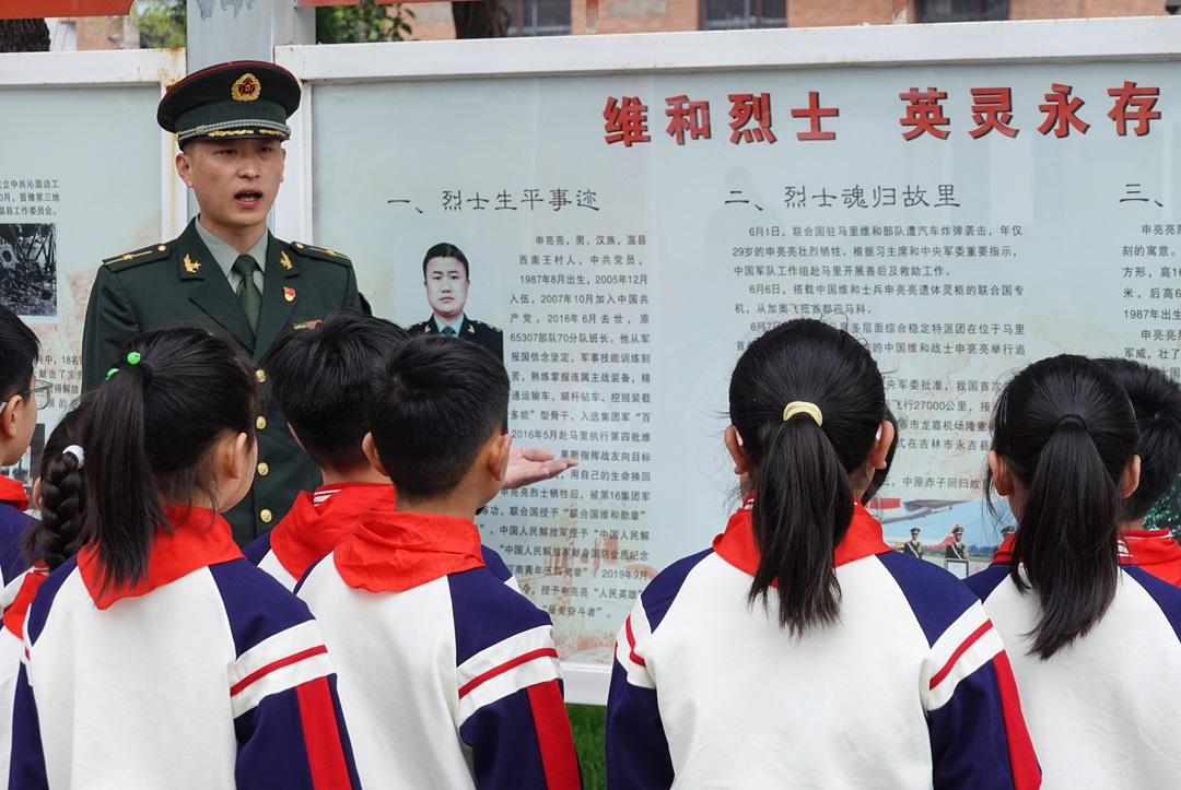 該旅駐地烈士陵園,每年有數(shù)萬人次來到這里,緬懷為維護(hù)世界和平犧牲的“人民英雄”。講解員張碩對(duì)前來參觀的學(xué)生們說:“申亮亮是部隊(duì)的英雄,也是我們心中的英雄?!?/p>