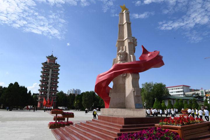 這是2019年7月22日在甘肅會(huì)寧縣紅軍會(huì)寧會(huì)師舊址拍攝的雕塑和會(huì)師紀(jì)念塔。新華社記者 馬寧 攝