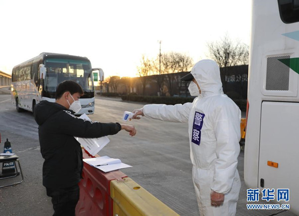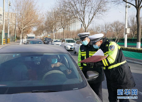 1月10日,石家莊市公安局裕華區(qū)交通警察大隊民警檢查外出車倆和人員的證件。