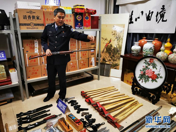 陜西省武功縣公安局局長李寧展示以蔡國強等人為首的黑社會性質(zhì)組織案件中的一把涉案槍支(2020年11月5日攝)。新華社記者 姚友明 攝