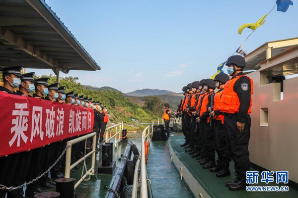 2月23日,參巡隊(duì)員在執(zhí)法艇上列隊(duì)站坡與岸上歡送的民警告別。 新華社發(fā)(趙越 攝)