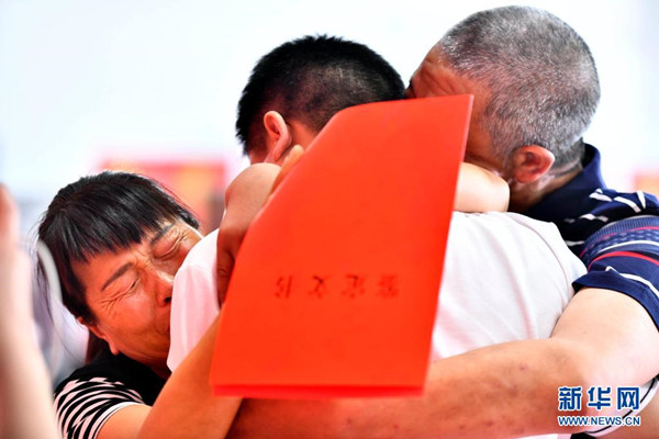 6月8日,在“認(rèn)親,我們?cè)谛袆?dòng)”濟(jì)南主會(huì)場(chǎng),90歲高齡的羅鳳坤(中)緊摟著被拐58年的兒子羅亞軍哭泣。新華社記者 郭緒雷 攝