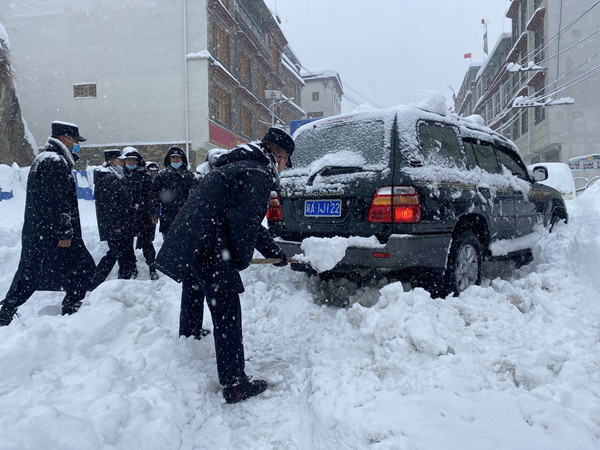 據(jù)了解,被困車輛是前來吉隆鎮(zhèn)旅游的,由于降雪過大導致最初車輛停放位置不易繼續(xù)停車,需要安全轉(zhuǎn)移,結(jié)果沒走幾米就被困在了十字路口。移民警察連忙上前合理分工,幫助鏟除積雪營救被困車輛,同時疏散交通秩序,以免發(fā)生意外交通事故,不一會兒被困車輛就從雪堆里推了出來。