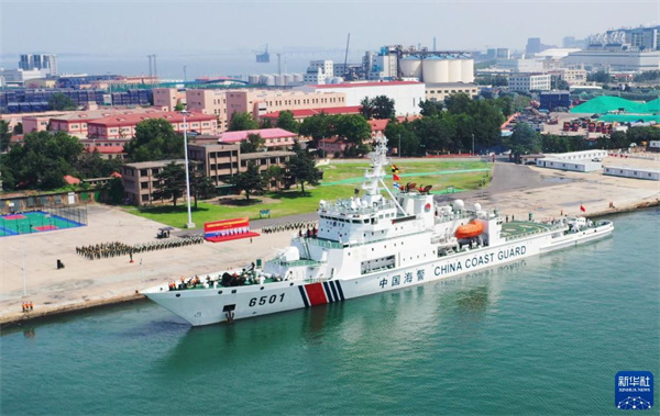 7月18日,中國海警局“長山艦”駛離碼頭(視頻截圖)。新華社發(fā)