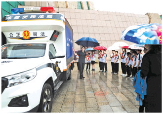 5月22日是國際生物多樣性日,重慶市渝北區(qū)人民法院與重慶自然博物館共同邀請西南師范大學實驗小學學生走進重慶自然博物館,通過“法治教育+科普展覽”,讓環(huán)保理念深植同學們心中。圖為法院干警在車載便民法庭旁向同學們講解長江“十年禁漁”計劃。