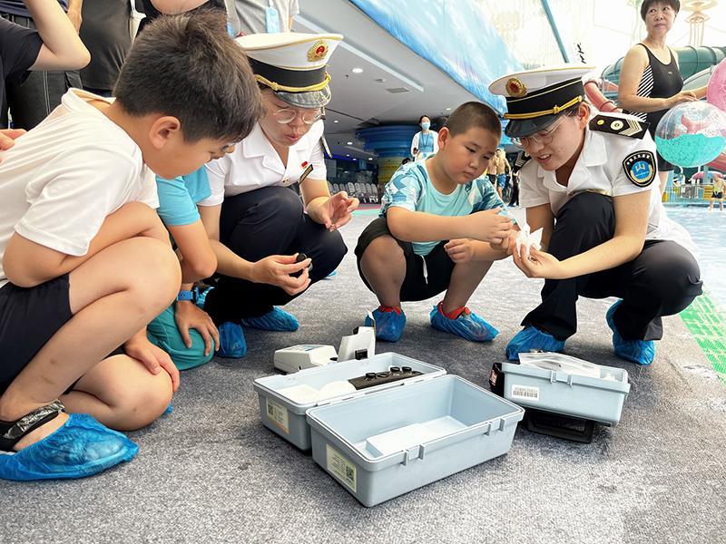 7月19日,北京市衛(wèi)生健康監(jiān)督所開(kāi)展“關(guān)注泳池水質(zhì) 體驗(yàn)衛(wèi)監(jiān)執(zhí)法”開(kāi)放日活動(dòng),邀請(qǐng)市民朋友走進(jìn)水立方嬉水樂(lè)園,親身體驗(yàn)游泳場(chǎng)所衛(wèi)生監(jiān)督全過(guò)程。圖為衛(wèi)生監(jiān)督員邀請(qǐng)小朋友一同體驗(yàn)快速檢測(cè)泳池水余氯情況。