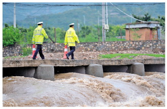 圖為天津市公安局薊州分局民警在有安全隱患的漫水橋處設(shè)置提醒標(biāo)識。 本報通訊員 呂志會 攝