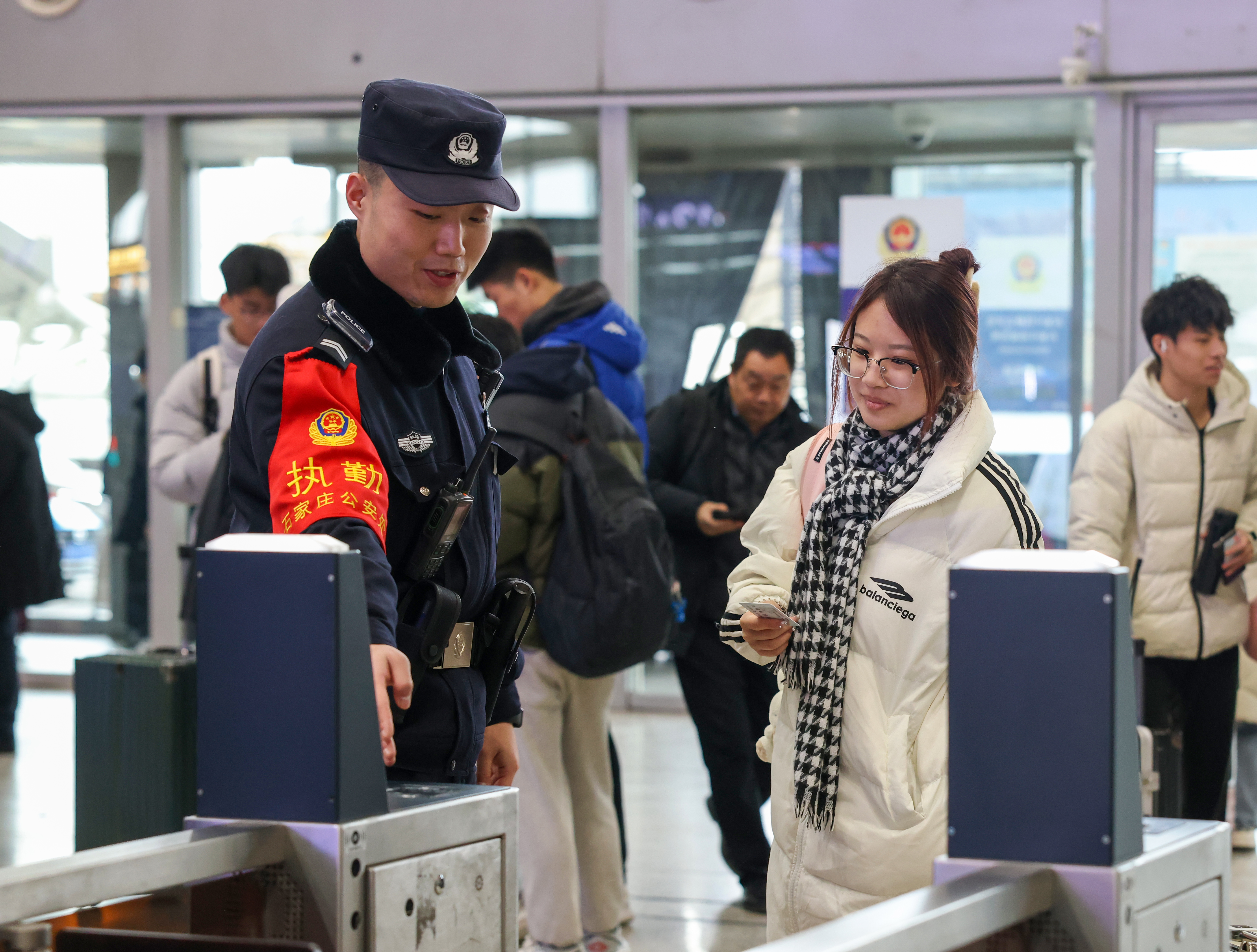 隨著高校寒假開(kāi)啟,大學(xué)生客流持續(xù)攀升,北京鐵路公安局石家莊公安處石家莊站派出所近日深入開(kāi)展暖心護(hù)航行動(dòng),開(kāi)通綠色通道,全力保障學(xué)生旅客平安出行。圖為民警指引大學(xué)生旅客使用自動(dòng)閘機(jī)進(jìn)站乘車(chē)。