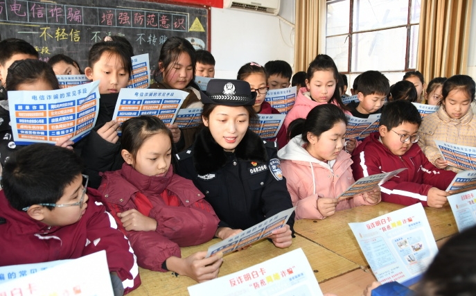 近日,河南省??h公安局衛(wèi)溪派出所組織民警走進(jìn)中小學(xué)校開設(shè)“平安課堂”,向?qū)W生宣傳講解安全防范知識。圖為民警向?qū)W生發(fā)放《反詐明白卡》,并講解反詐防詐知識。