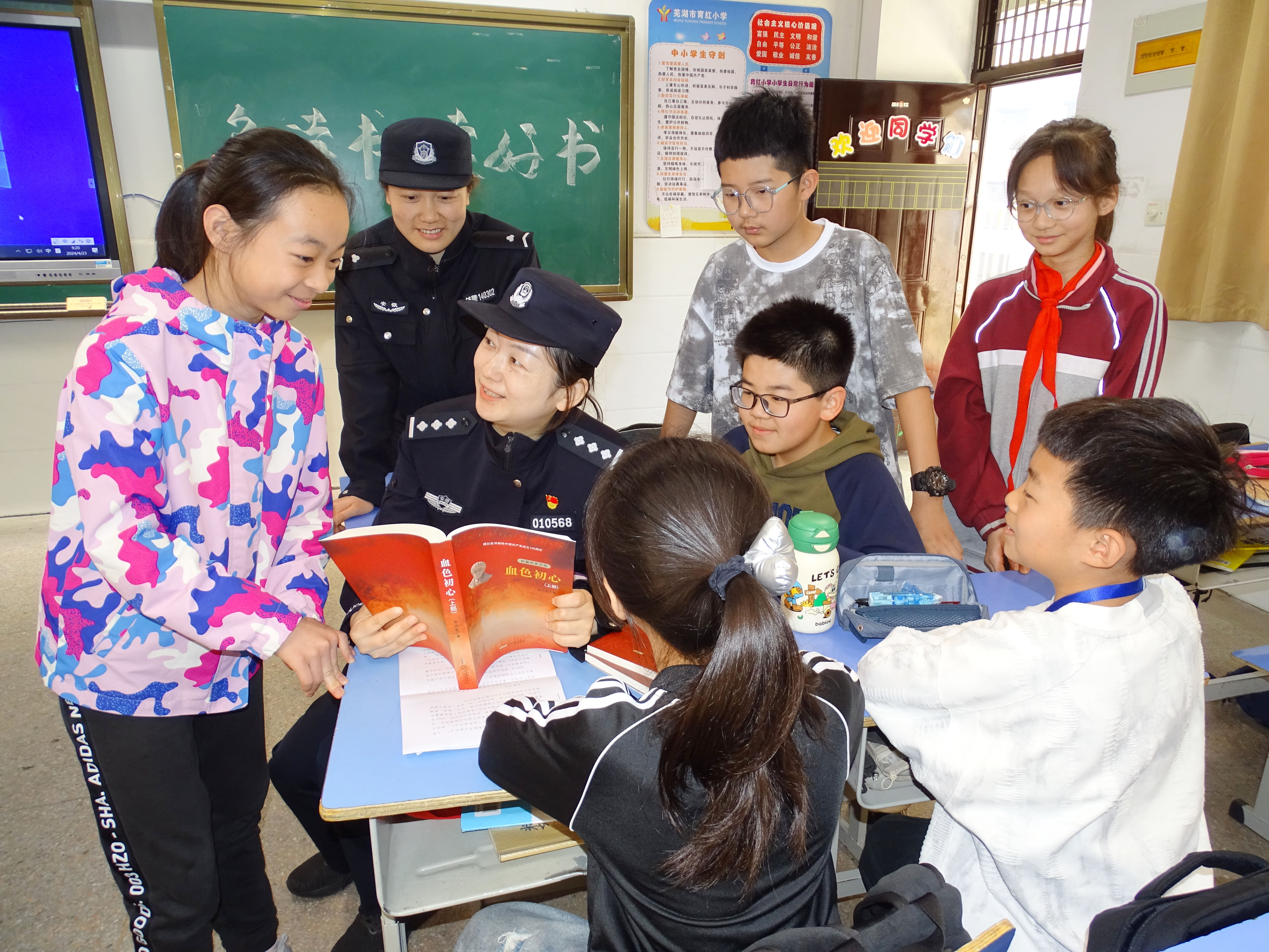 4月23日,安徽省蕪湖市公安局鏡湖分局濱江派出所組織民警來到轄區(qū)育紅小學(xué)開展世界讀書日主題宣傳教育活動,引導(dǎo)孩子們讀好書、勤讀書,從書中汲取養(yǎng)分。圖為民警與孩子們同讀一本書。