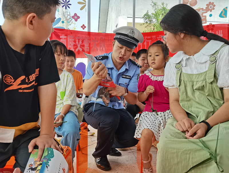 8月15日,安徽省南陵縣公安局交管大隊(duì)民輔警在轄區(qū)兒童中開展交通安全宣傳活動(dòng),增強(qiáng)他們知危險(xiǎn)、會(huì)避險(xiǎn)意識(shí)。