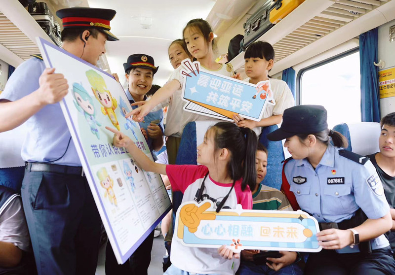 近日,杭州鐵路公安處乘警支隊乘務(wù)一大隊聯(lián)合杭州客運段甬西車隊開展“迎亞運、護(hù)平安”宣傳活動。
