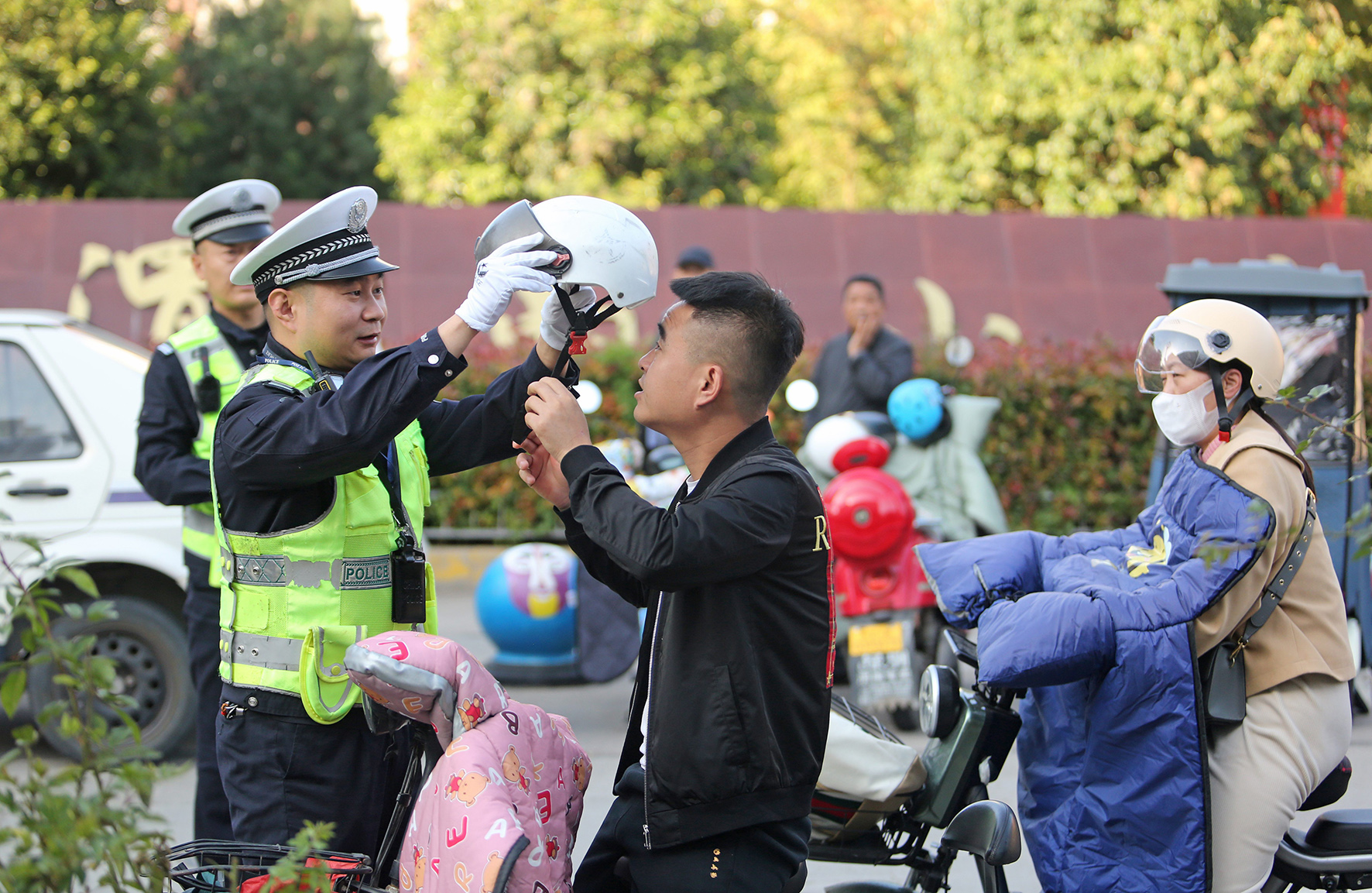 10月20日,陜西省渭南市區(qū)樂天大街中段,民警提醒市民佩戴好安全頭盔。連日來,陜西省渭南市公安局交警支隊組織中心城區(qū)開展“一盔一帶”專項整治行動。民警采取“勸導(dǎo)+教育”的方式,對駕乘電動自行車未佩戴安全頭盔群眾進(jìn)行查糾、勸導(dǎo),不斷提升市民安全出行意識。