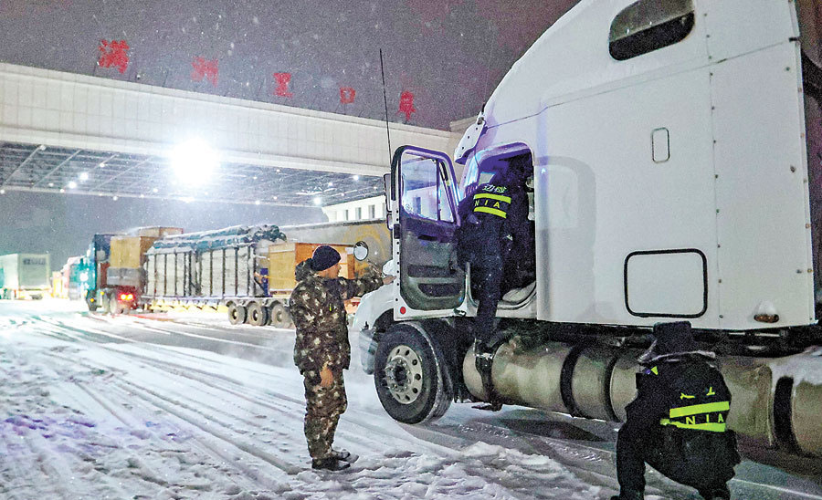 12月7日晚,內(nèi)蒙古自治區(qū)滿洲里市遭遇強(qiáng)降雪天氣,氣溫降至零下30攝氏度,滿洲里出入境邊防檢查站迅速啟動(dòng)應(yīng)急預(yù)案,加強(qiáng)口岸管控力度,強(qiáng)化重點(diǎn)區(qū)域巡查,確保口岸通關(guān)安全有序。(李發(fā)春)
