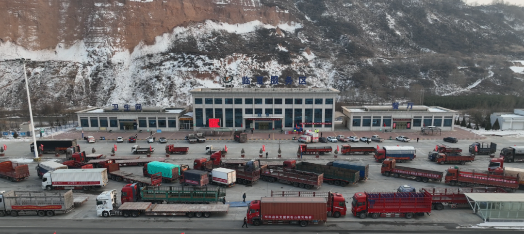 運送救災(zāi)物資的貨車車隊在臨夏服務(wù)區(qū)休整