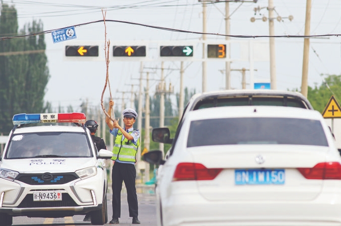 圖為民警冒著高溫,用斷落樹枝頂起光纜,以保證車輛順暢通行。胡國(guó)華攝