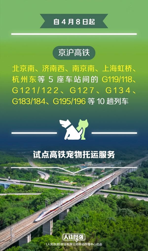 鐵路部門持續(xù)深化運(yùn)輸供給側(cè)結(jié)構(gòu)性改革,積極適應(yīng)廣大旅客多樣化的出行需求,在廣泛聽(tīng)取旅客意見(jiàn)、深入開(kāi)展市場(chǎng)調(diào)查基礎(chǔ)上,經(jīng)過(guò)專業(yè)測(cè)試評(píng)估,自4月8日起在京滬高鐵北京南、濟(jì)南西、南京南、上海虹橋、杭州東等5座車站間的G119/118、G121/122、G127、G134、G183/184、G195/196等10趟列車上試點(diǎn)高鐵寵物托運(yùn)服務(wù)。