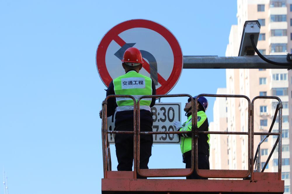 圖為本溪交警聯(lián)合相關(guān)部門對(duì)指示牌進(jìn)行安裝檢查。