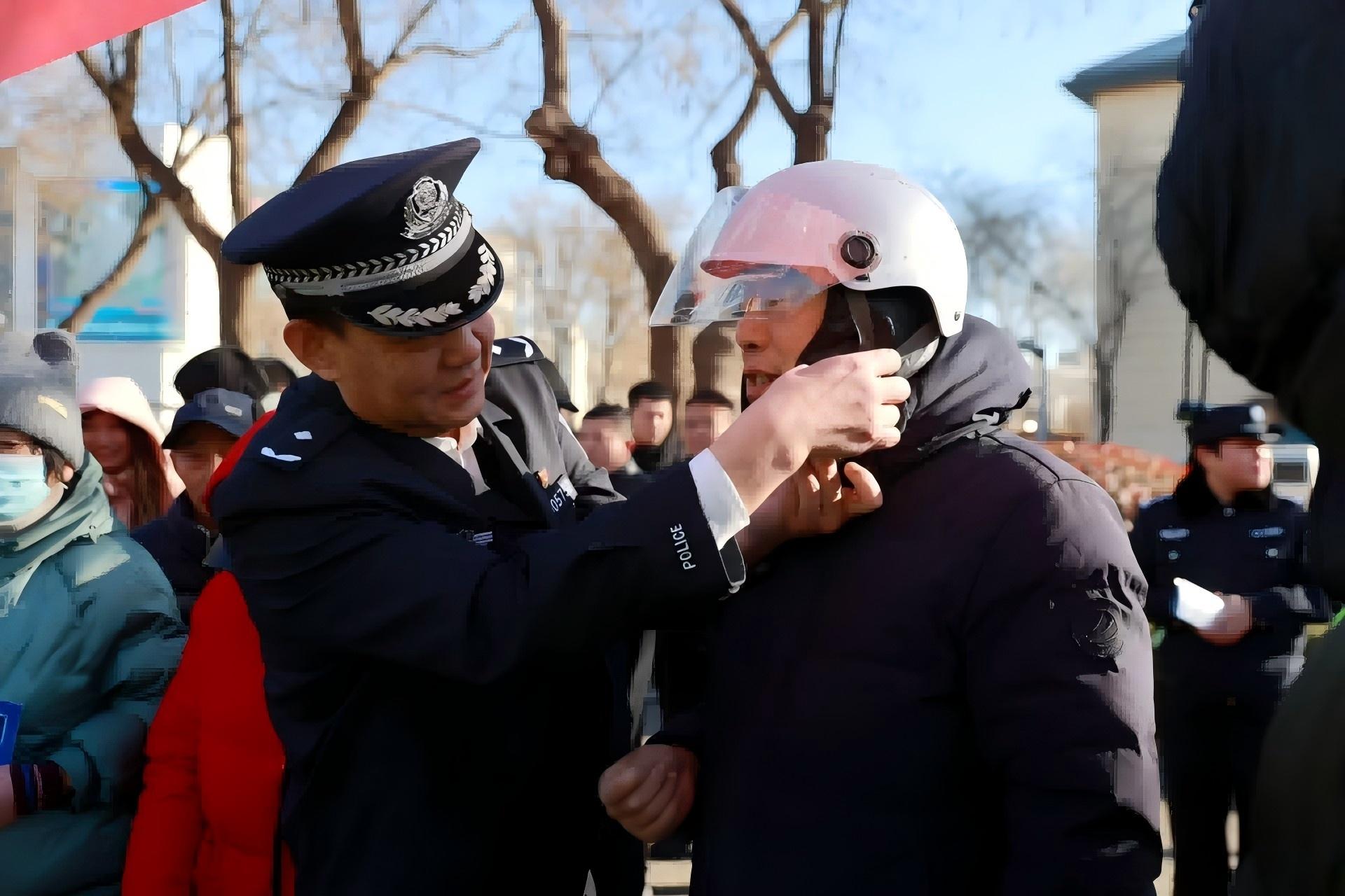 圖為長清交管大隊(duì)民警向群眾演示安全頭盔的正確佩戴方法。