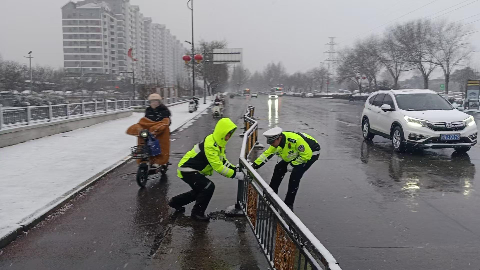 在疏導(dǎo)交通的同時,執(zhí)勤交警時刻關(guān)注路面狀況,及時處置各類突發(fā)險情。1月29日晚,高速各大隊為防止雪后路面、橋面結(jié)冰,聯(lián)合交通運(yùn)輸?shù)炔块T預(yù)防性播撒融雪劑;30日早高峰期間,勤務(wù)四大隊執(zhí)勤人員在大南門附近發(fā)現(xiàn)因風(fēng)雪倒地的護(hù)欄,迅速合力將其扶正固定,消除了由此可能引發(fā)的交通事故隱患;勤務(wù)一大隊則加強(qiáng)了對轄區(qū)國省道、橋梁、涵洞等重點(diǎn)路段的巡邏頻次,細(xì)致排查積雪、結(jié)冰及各類安全隱患,確保不放過一處風(fēng)險。