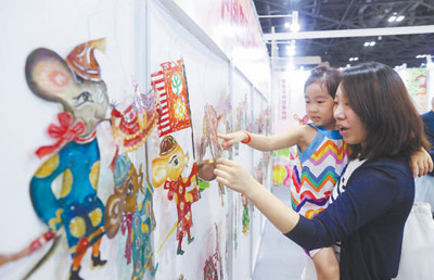 家長與孩子在首屆中國(北京)動(dòng)畫周上觀看展出的皮影。陳曉根攝