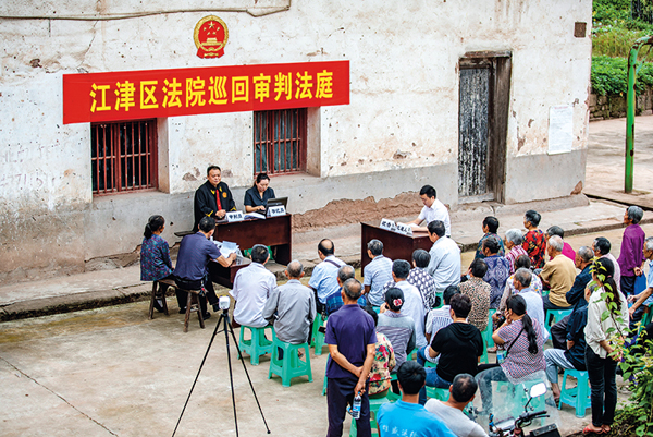 2021年9月17日,重慶市江津區(qū)蔡家鎮(zhèn)文昌村塘口村民小組,基層法官在巡回審判法庭審理案件 黃偉攝/本刊