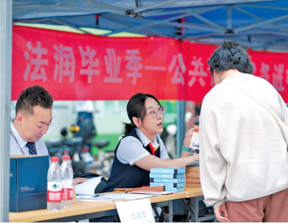 六月五日,在北京市司法局與首都師范大學(xué)聯(lián)合舉辦的“法潤(rùn)畢業(yè)季”活動(dòng)中,公證處工作人員在校內(nèi)設(shè)立流動(dòng)公證服務(wù)點(diǎn),為有需求的同學(xué)提供便捷的公證指引。據(jù)悉,只要當(dāng)事人的材料齊全,符合受理?xiàng)l件及出證條件,跑一次就可以辦好公證書(shū)。 (北京市司法局供圖)