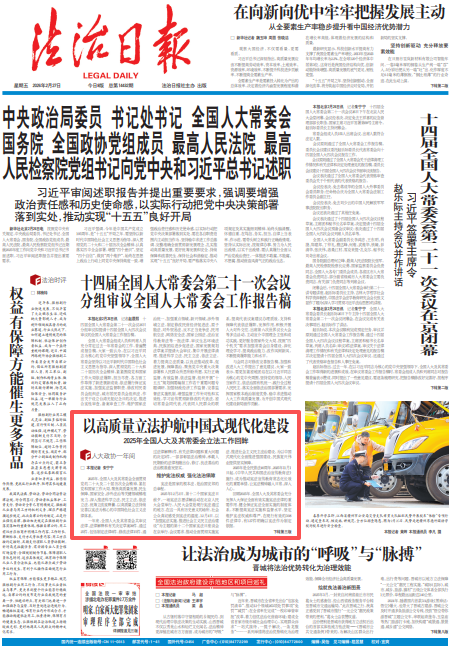 2025年,全國(guó)人大及其常委會(huì)全面貫徹黨的二十大及二十屆歷次全會(huì)精神,緊扣黨和國(guó)家工作大局,聚焦高質(zhì)量發(fā)展、民生保障、國(guó)家安全、涉外法治等關(guān)鍵領(lǐng)域精準(zhǔn)發(fā)力,深入推進(jìn)科學(xué)立法、民主立法、依法立法,統(tǒng)籌立改廢釋纂,以高質(zhì)量立法持續(xù)完善以憲法為核心的中國(guó)特色社會(huì)主義法律體系。