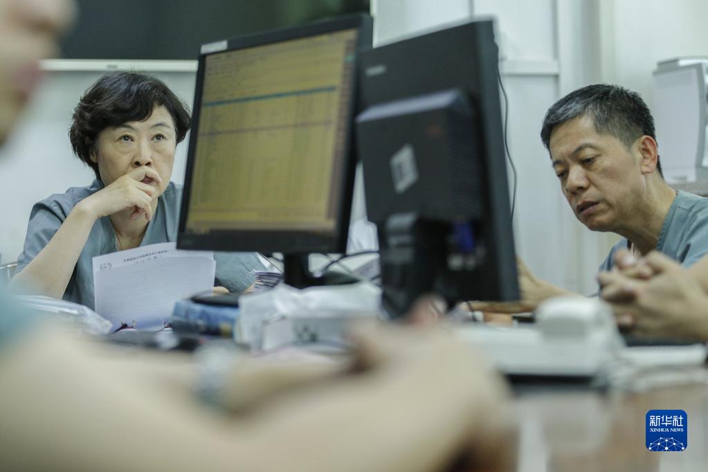 錢素云(左)在辦公室參加病例討論(2019年7月31日攝)。新華社記者 才揚(yáng) 攝
