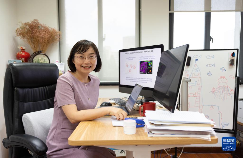 陳玲玲在中國科學(xué)院分子細(xì)胞科學(xué)卓越創(chuàng)新中心辦公室留影,右側(cè)是她女兒的畫作(2022年8月11日攝)。新華社記者 金立旺 攝
