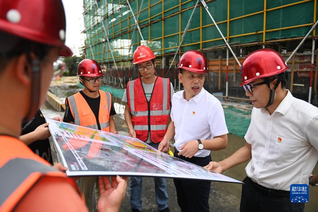 在浙江省寧波市奉化區(qū)蕭王廟街道滕頭村,傅平均(右二)在村黨群服務(wù)中心大樓建設(shè)工地察看施工進展(9月16日攝)。新華社記者 黃宗治 攝