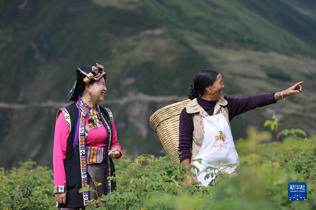 9月25日,陳望慧在四川阿壩州小金縣新橋鄉(xiāng)共和村的玫瑰園中與村民交流。新華社記者 劉瓊 攝