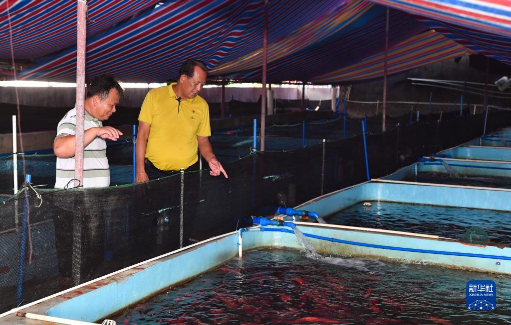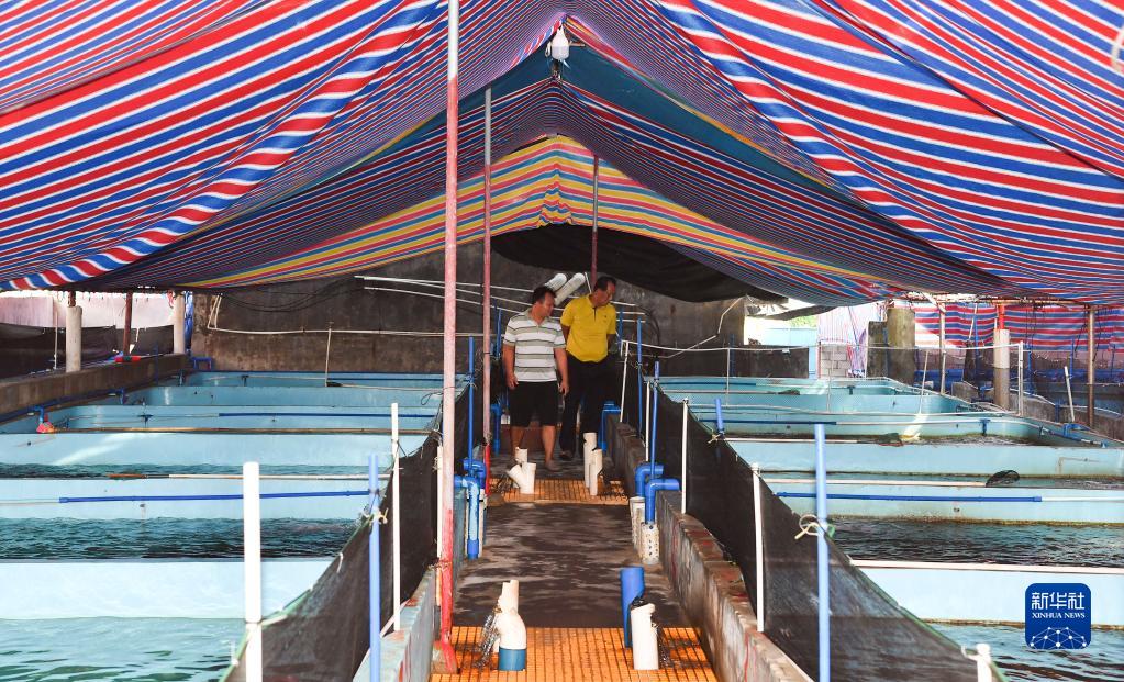 王書茂(右)在海南省瓊海市潭門鎮(zhèn)潭門村的一處養(yǎng)殖基地調(diào)研(9月14日攝)。新華社記者 楊冠宇 攝