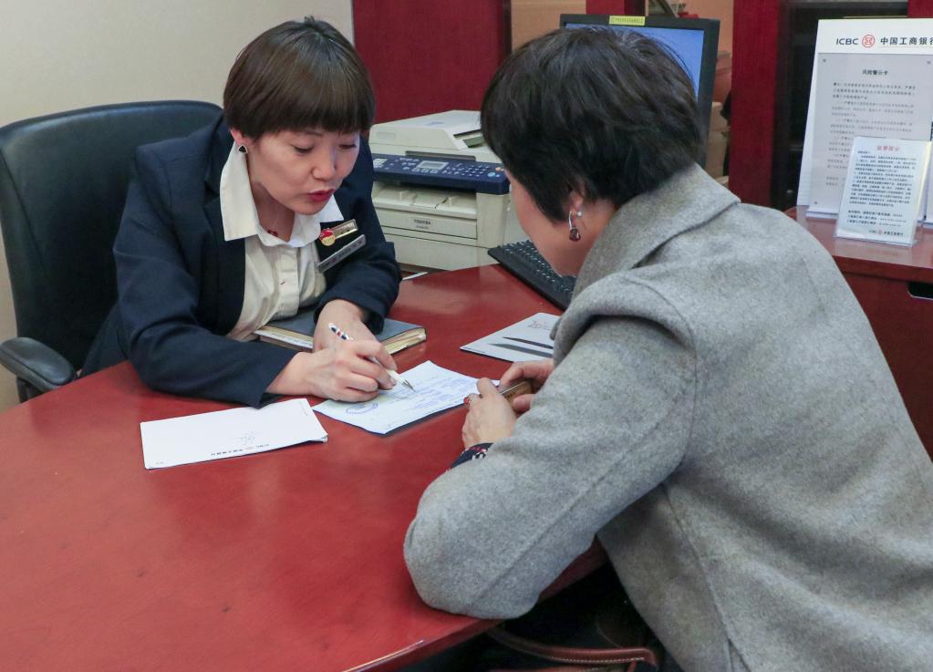 在中國(guó)工商銀行新疆烏魯木齊的一處營(yíng)業(yè)網(wǎng)點(diǎn),李鵬(左)為客戶解答問題(2018年11月攝)。新華社發(fā)