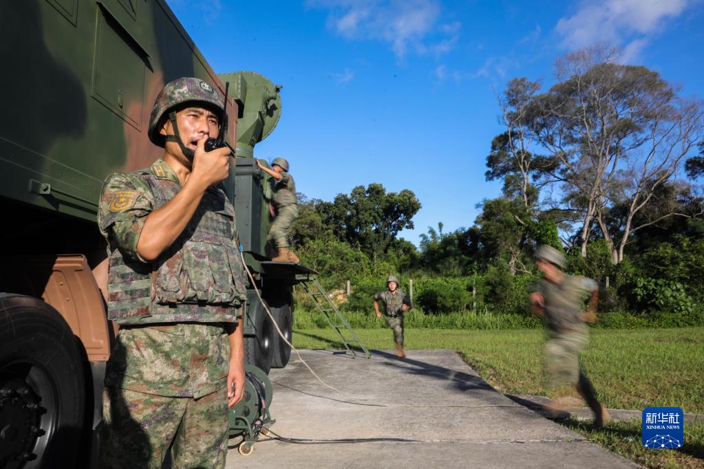 駐香港部隊某團防空營營長王海旭(左)在訓練中下達作戰(zhàn)指令(2022年7月21日攝)。新華社發(fā)(田越洋 攝)
