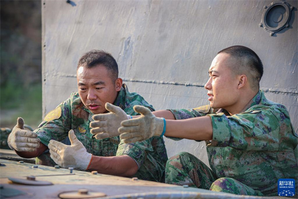 陸軍第71集團(tuán)軍某旅“濟(jì)南英雄連”連長(zhǎng)孫金龍(左)向步戰(zhàn)車駕駛員請(qǐng)教專業(yè)知識(shí)(2022年9月18日攝)。新華社發(fā)(黃振宇 攝)