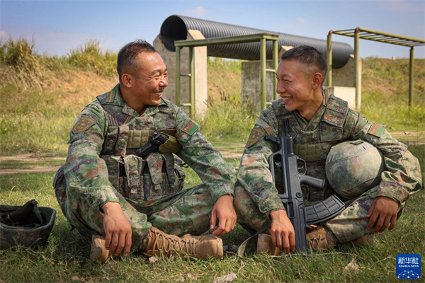 陸軍第71集團(tuán)軍某旅“濟(jì)南英雄連”連長(zhǎng)孫金龍(左)在訓(xùn)練結(jié)束后與戰(zhàn)士談心(2022年9月22日攝)。新華社發(fā)(黃振宇 攝)