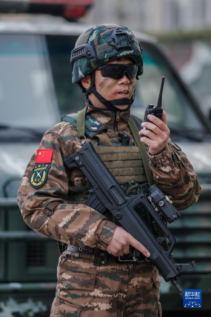 武警河北總隊某部大隊長李闖在演練中下達任務指令(2021年3月4日攝)。新華社發(fā)(張丹 攝)